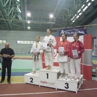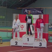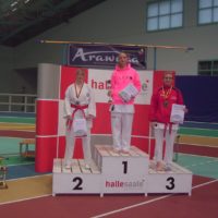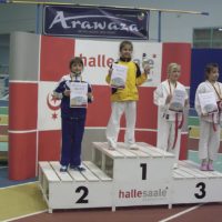 Für 13.00 Uhr waren die Kumitedisziplinen angesetzt. Hier begann der Wettkampf für die noch junge Sportlerin Samantha Michalak. In ihrem erst zweiten Turnier überhaupt, konnte Samantha ihr Leistungsvermögen zeigen und ihre erlernten Fähigkeiten umsetzen.Sie gewann ihren ersten Kampf klar mit 11:6 gegen eine Sportlerin aus Kemtau.Im Halbfinale unterlag sie jedoch knapp der amtierenden Landesmeisterin aus Sachsen – Anhalt Jasmin Röper. In den nun anstehenden Trostrunden konnte Samantha noch einmal ihre Kräfte mobilisieren und erkämpfte Bronze hinter Röper und einer Sportlerin aus Polen.